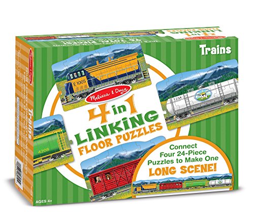 -. Binding : Toy -. Brand : Melissa & Doug -. EAN : 0000772089104 -. Feature : Four 24-piece cardboard jigsaw puzzles that link together to make one 5-foot-long train scene / Mix and match the 17 x 11-inch (43 x 28 cm) train-themed puzzles to change the scene / Coded pieces make for easy sorting / Easy-Clean surface / For ages 3+; 12" x 9.25" x 3" package -. Label : Melissa and Doug -. Manufacturer : Melissa and Doug -. Model : 8910 -. MPN : 8910 -. PackageQuantity : 1 -. PartNumber : 8910 -. ProductGroup : Toy -. ProductTypeName : TOYS_AND_GAMES -. Publisher : Melissa and Doug -. Studio : Melissa and Doug -. Title : Melissa & Doug Trains Linking Floor Puzzle (96 Piece) -. UPC : 000772089104 -. Warranty : No Warranty