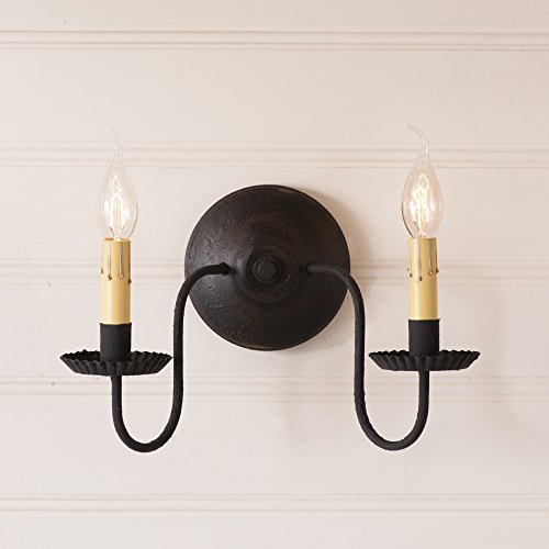-. Feature : Measures 9-Inch high and 12.5-Inch wide and 7.5-Inch deep / Direct hardwire; 2 candelabra sockets, 2 x 60 watts maximum wattage / UL listed for dry locations / Textured black over red painted finish and black textured arms with crimped pans / Made in the USA