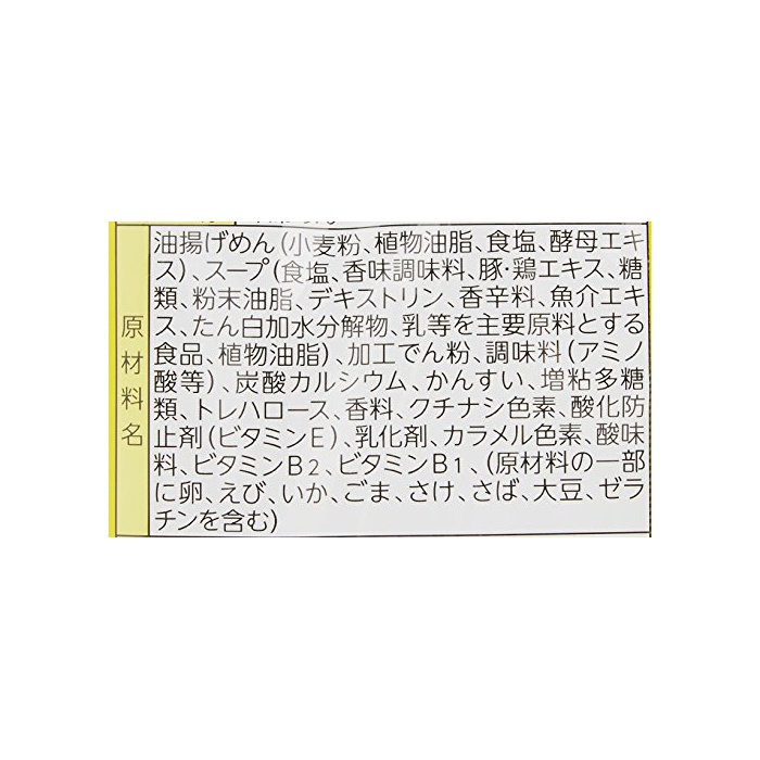 원재료:유부 면(소맥분,식물성 기름지,식염,효모 엑기스)고, 스프(식염,돈닭 엑기스,향기 맛 조미료,당류,식물성 기름지,향신료,생선 및 조개류 엑기스,단백 가수분해물,젖 등을 주요 원료라고 하는 식품,효모 엑기스,향기 맛유)고, 가공 나오지 않겠 분,조미료(아미노산등)고, 탄산 칼슘,트레이닝 헬로《스》,물어 들이마시고, 증점다당류,치자나무 색소,카라멜 색소,유화 제,산화 방지제(비타민E)고, 신맛료,향신료 추출물,향료,비타민B2,비타민B1,(원재료의 일부에 대두,젤라틴,가고, 알,새우,하 #고, 하면을 포함한다)