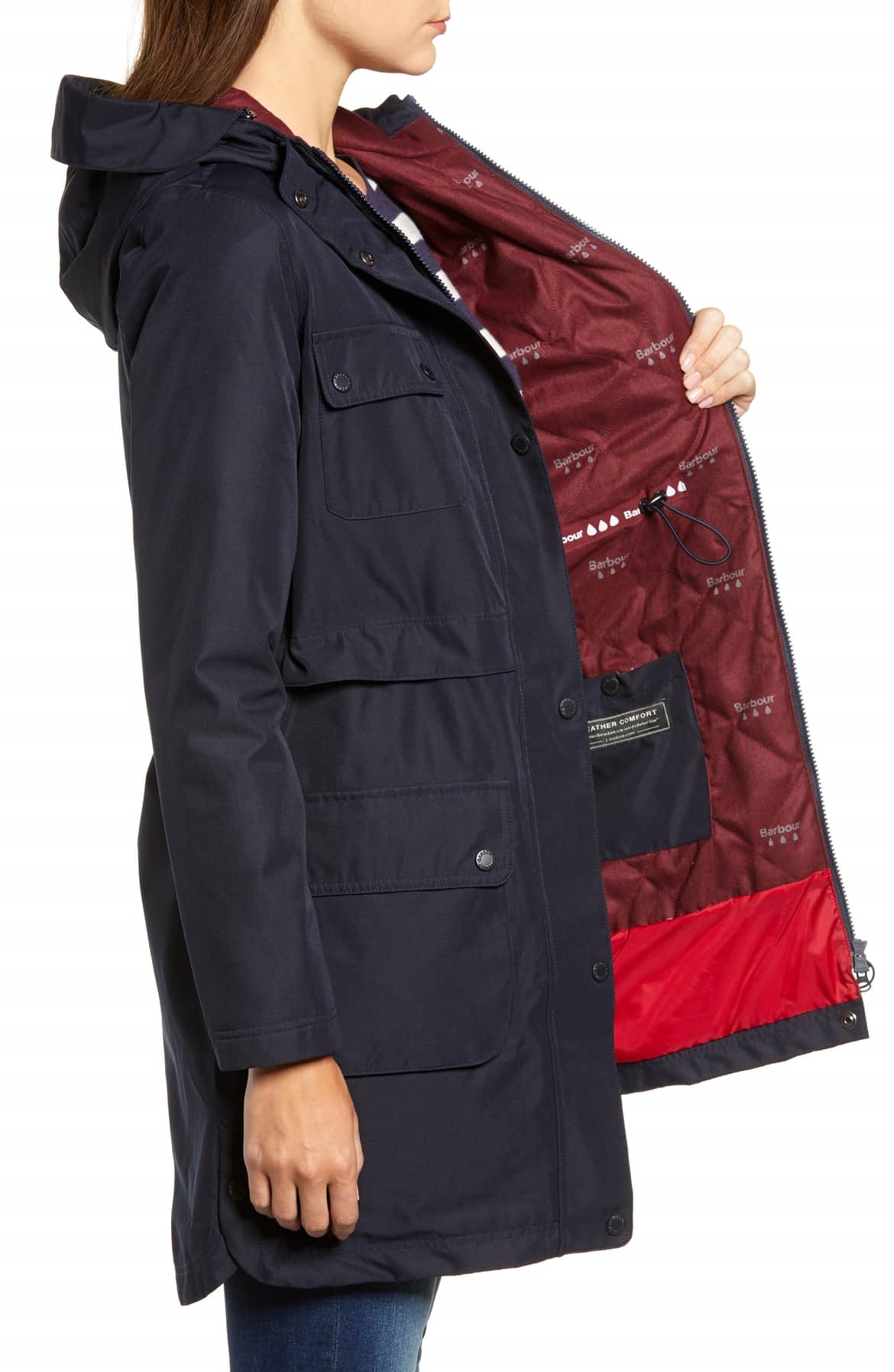 1. Description 1) The Women's Barbour isobar waterproof jacket is the perfect way to stay stylish and dry this season, and no stylish ladies wardrobe is complete without it. 2) Boasting a fixed hood and waterproof capabilities, the jacket also has a yoke feature on the front and back, which allows this jacket to offer you excellent protection from whatever Mother Nature might throw at you when you are out and about. 3) Like all Barbour jackets it includes some finer design details that makes them so stylish, the Isobar comes with side stud fastening and a dipped hem at the back and simply looks great when on. 4) It also boasts four front patch pockets which contributes to the style and also gives you plenty of room to store your essentials when you are out and about. 5) The Barbour weather comfort logo is embroidered on the left pocket which adds that final stamp of quality and rounds of the great look and design this jacket projects.