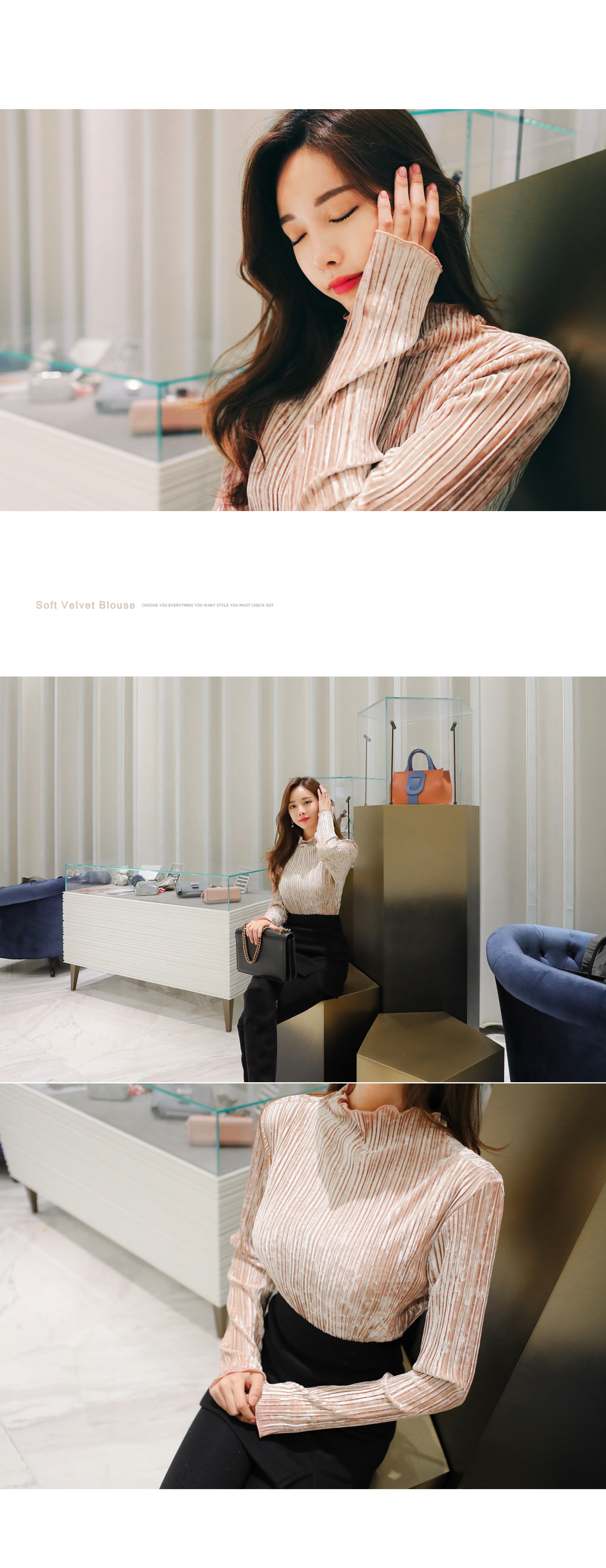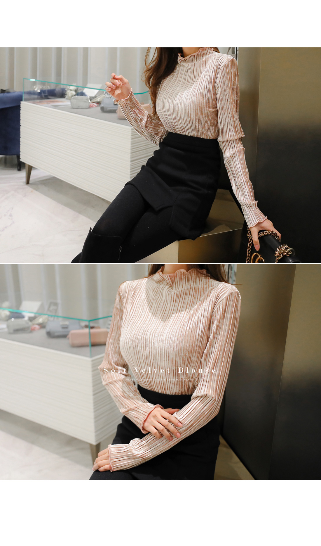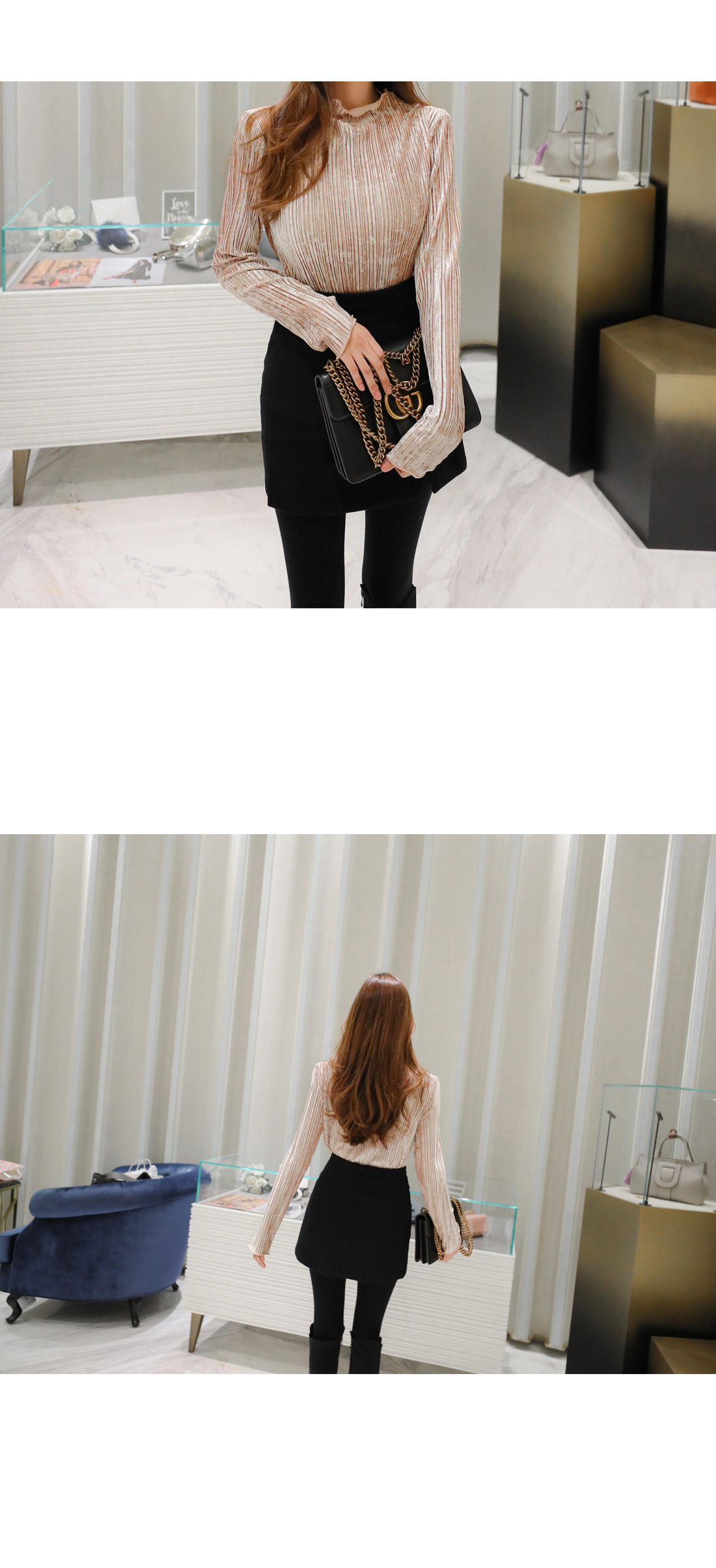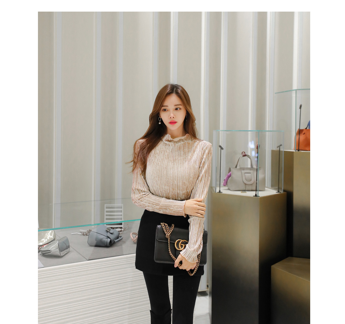 플리츠 원단이 매력적인 페미닌 무드 벨벳 티셔츠를 소개해요.