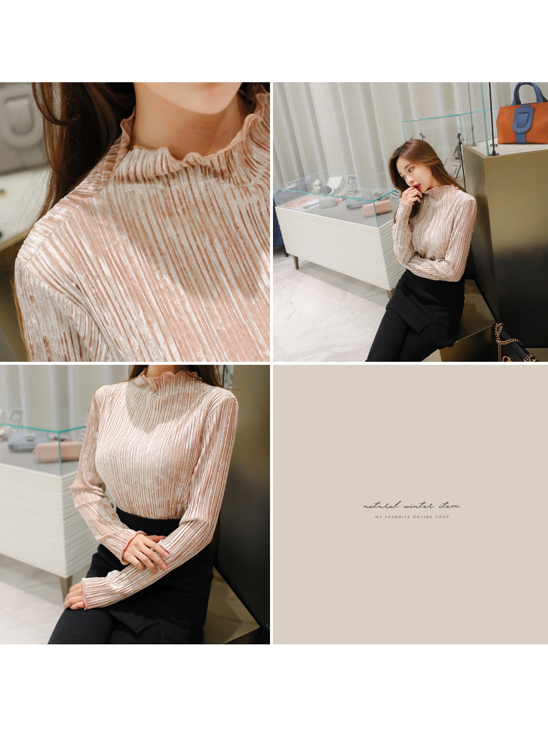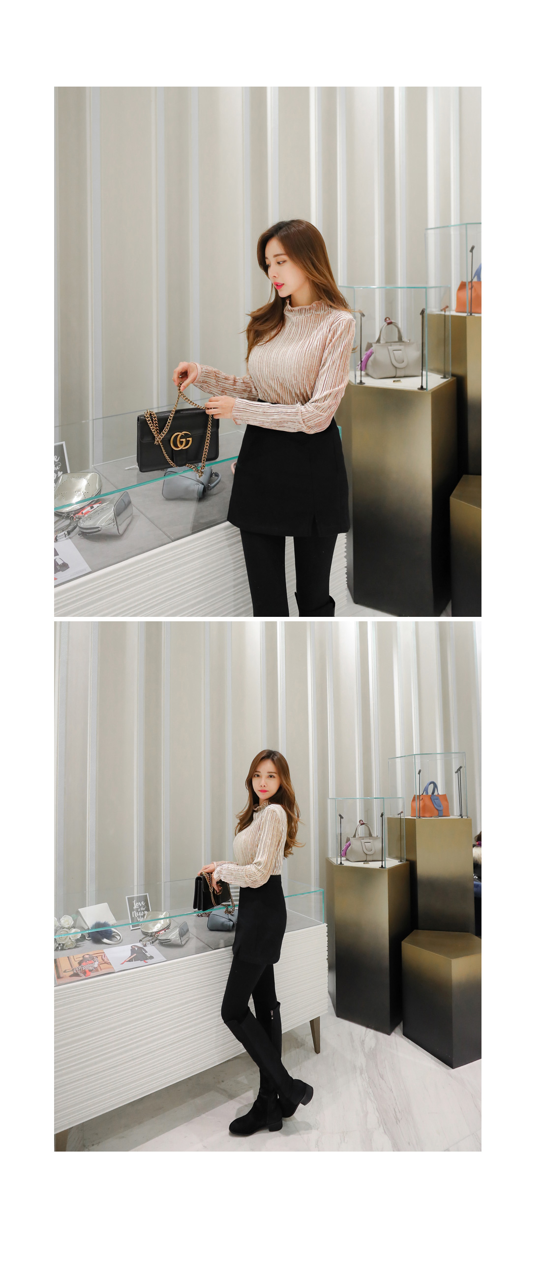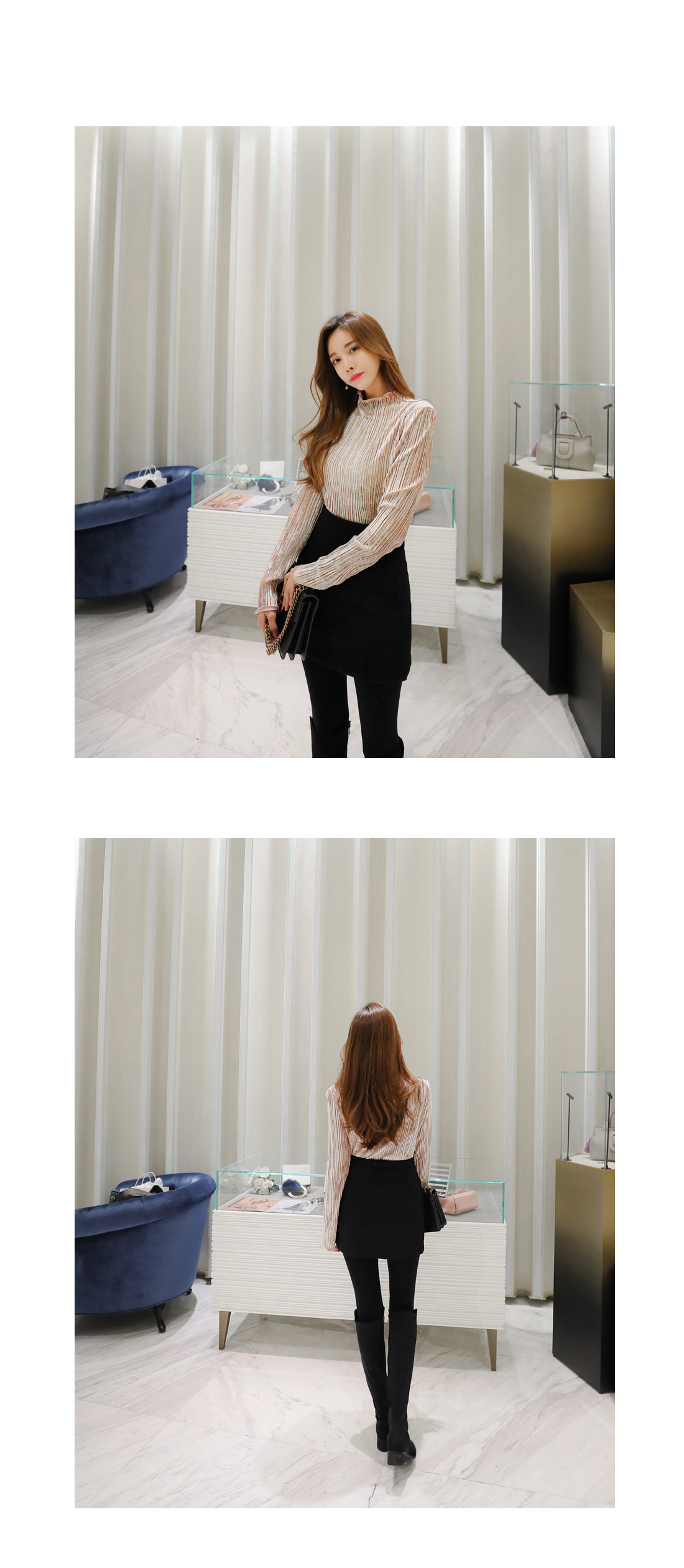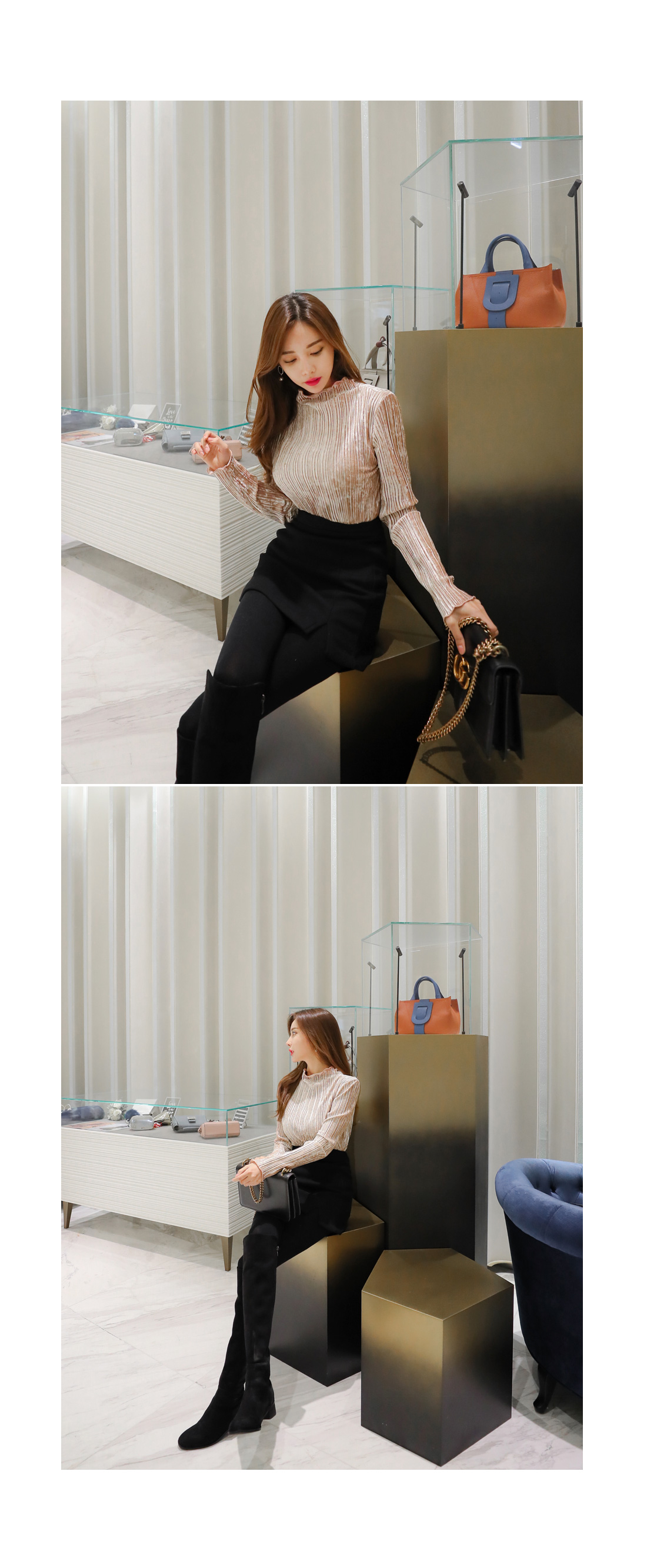 플리츠 원단이 매력적인 페미닌 무드 벨벳 티셔츠를 소개해요.