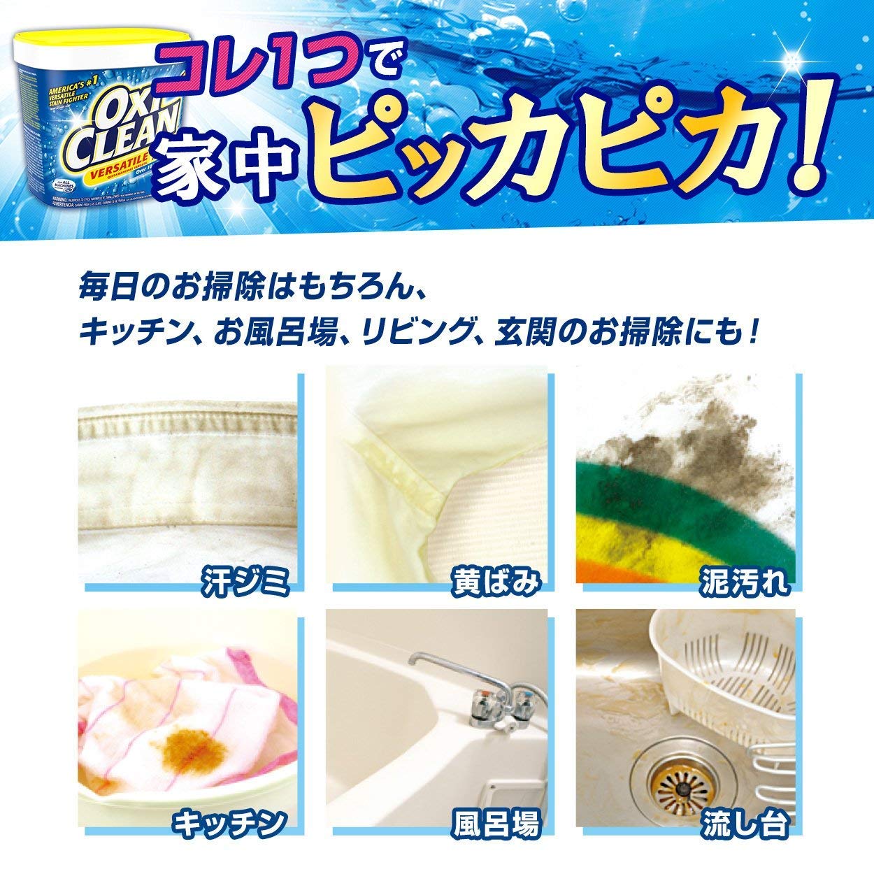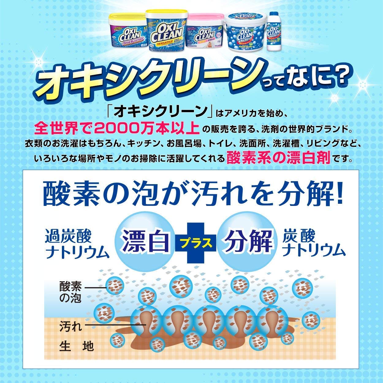 ▼ 用途もいろいろ使えて便利:水に溶けると酸素の泡を大量に発泡し、頑固なシミ・汚れや臭いの元をすっきり洗浄。衣類やカーペットの食べこぼし、 シャツの汗ジミや黄ばみ、ふきんなどの布製品や靴下の泥汚れ、ペットのマーキング、部屋干しの臭い、食器の茶渋などに驚きの洗浄力と消臭効果を発揮します。