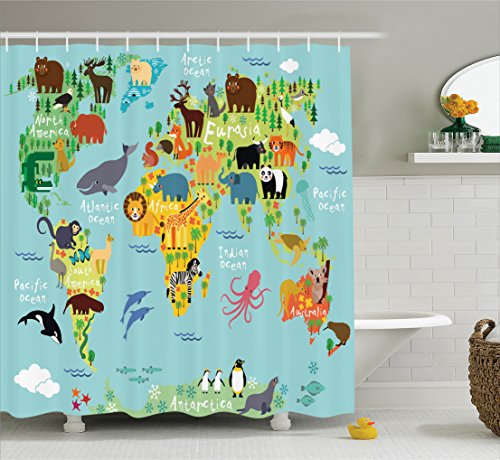 Wanderlust Shower Curtain Decor by Ambesonne, Animal Map of the World for Children and Kids Cartoon Mountains Forests Image, Polyester Fabric Bathroom Shower Curtain Set with Hooks, Green Yellow Blue