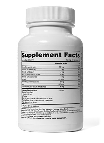 - Feature : Includes 200mg of caffeine per serving (two capsules), similar to most energy shots, at only a small fraction of the cost. / Uses a natural, herbally sourced form of caffeine (from Guarana Seed Extract), as opposed to the more processed form of caffeine (caffeine anhydrous) used in most caffeine products. / Includes a 100% RDA dose of the complete B-Vitamin Complex to aid metabolism and maintain energy.* / Includes complimentary sources of herbal energy from Green Tea Extract, Rhodiola, and Ginseng.* / Manufactured in the USA at a FDA inspected cGMP certified facility that has an "A" rating from two independent authorities.