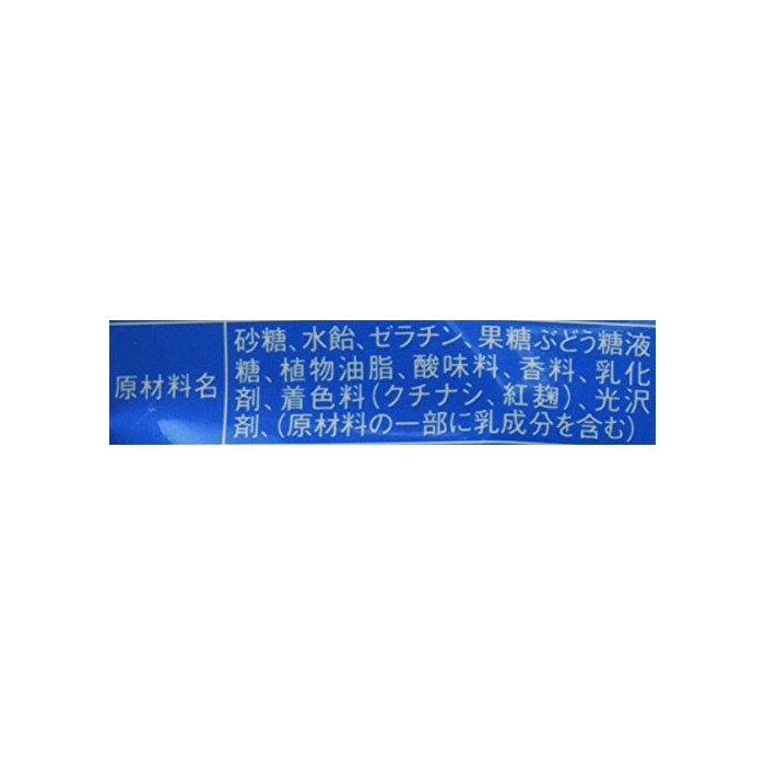 원재료:설탕,수 엿,젤라틴,과당 포도당액당,식물성 기름지,분말 Oblate,신맛료,향료,유화 제,착색료(치자나무,홍누룩)고, 광택 제,(원재료의 일부에 유성분,대두를 포함한다)