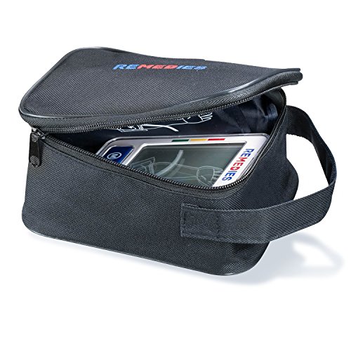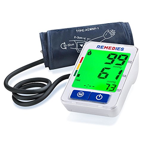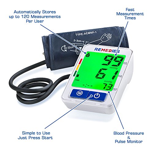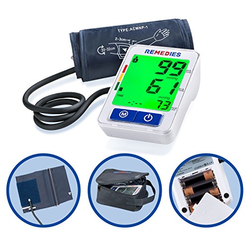 -. Feature : MOST ACCURATE & FAST READING METER: The Remedies Blood Pressure Machine will reduce any discomfort experienced due to over-inflation and will shorten the measurement time by using the oscillometric method of blood pressure measurement. Pressure accuracy- 3mm and pulse- 5% / PULSE MEASUREMENT: The cuffs snugs around your upper arm and with a touch of a button it pumps, inflates and deflates for an automatic accurate reading. Arm circumference of cuff is between 22cm-32cm. / MULTI USER RECORDINGS: Allows up to 2 users, each user has up to 120 readings in a recorded memory. See results in a simple to use large backlit color LCD digital display screen with 3 Color changing lights to help you understand your measurement and monitors results in the device. / CONSTANT MONITORING: Stay on top of your health and take It anywhere on the go, includes a portable travel kit case, you will never miss a reading. Perfect for seniors, elders, pregnant women and anyone who are always monitoring and checking their he / BATTERIES: No AC adapter needed, its wireless and it uses 4 AA batteries (included), battery life will last for 4/5 months for twice a day uses.