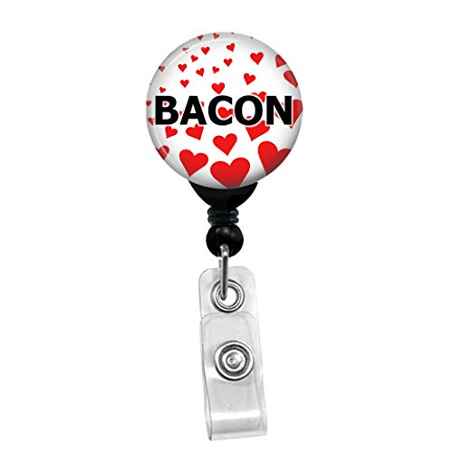 I Love Bacon - Retractable Badge Reel ID Card Name Tag Custom Badge Holder With Hearts Background (Black Badge Reel With Spring Pinch Clip)