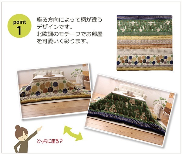 かわいい柄のこたつ布団です。表地には柔らかくソフトな肌感触の起毛生地を使用しています。リバーシブルタイプのこたつ布団なのでお部屋のシーンに合わせてお使いいただけます。薄手なのでかさばらず、コンパクトに収納できます。部分暖房のコタツは電気代もおトクです。