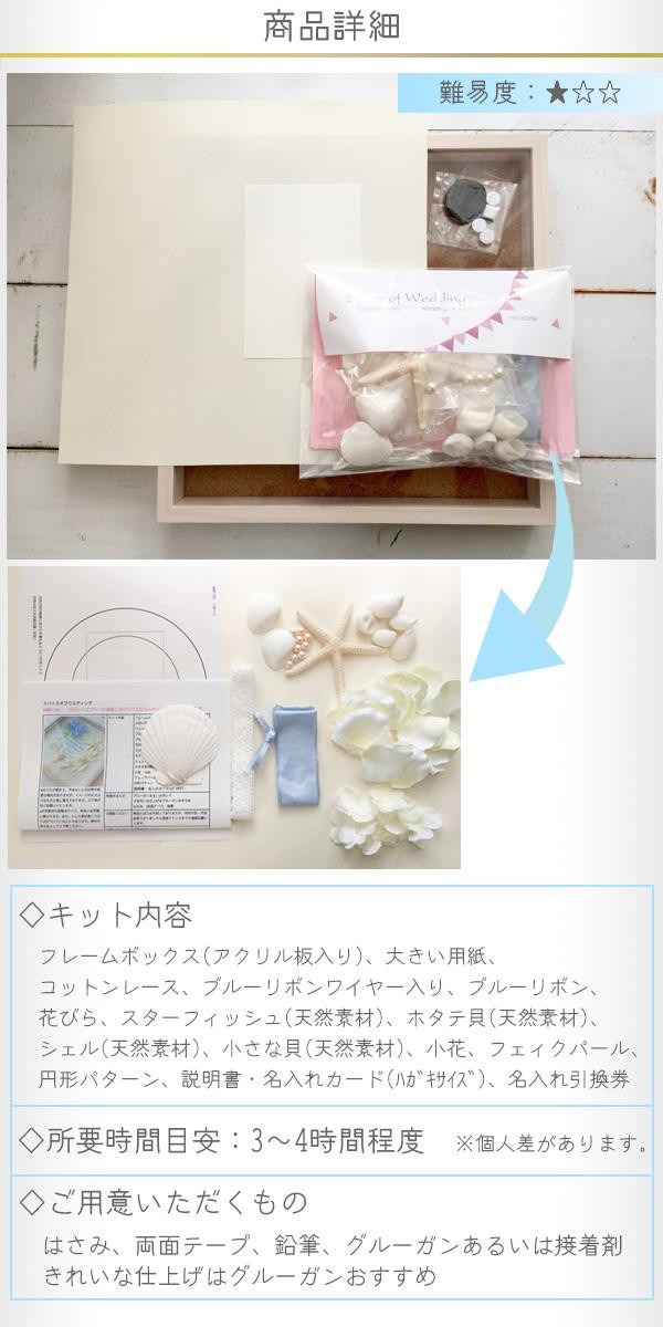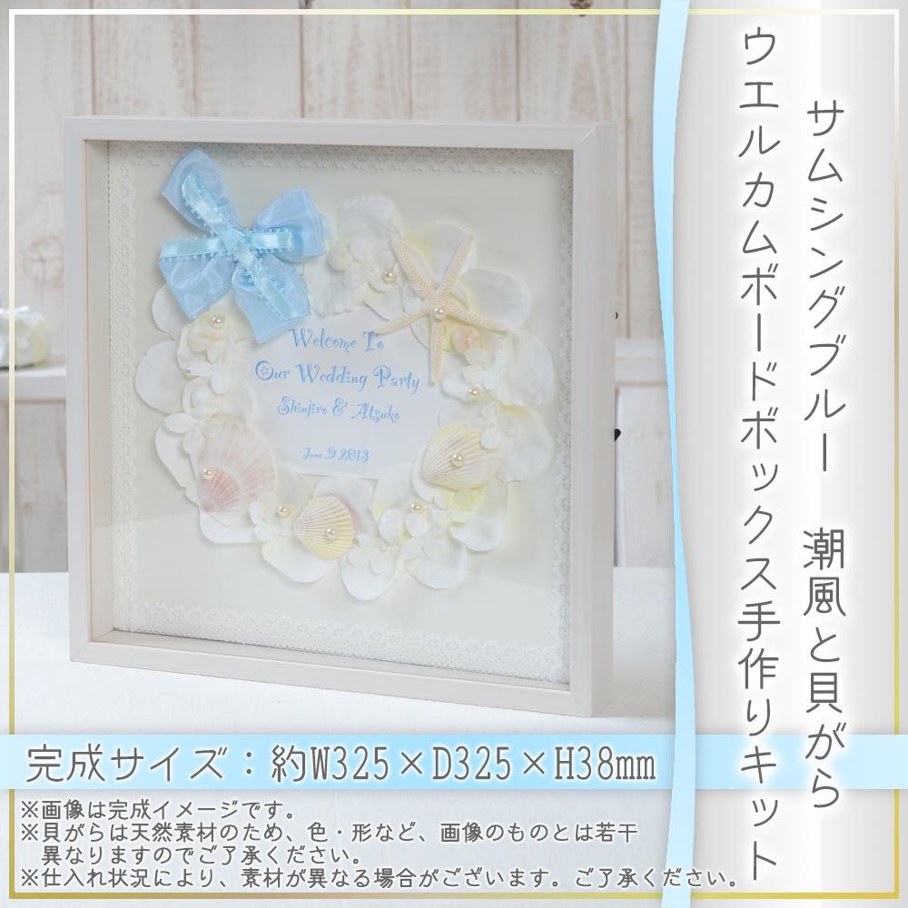 サムシングブルーのリボンがキュートなボックスインタイプのウエルカムボードキット。ラウンド型に花びらを貼り付けていくのがポイントです。パターンが入っているので簡単にできるのに本格的!!爽やかな貝がらのコラージュとパールの輝きが効いています。 |