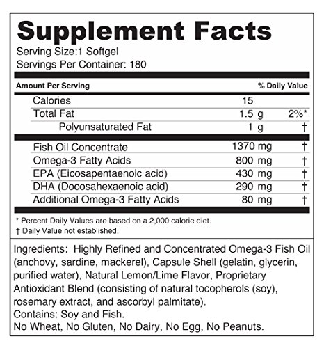 High Concentration of EPA and DHA for more Omega 3 benefits in fewer servings. Just one softgel delivers 800 mg. of Omega 3 Fatty Acids in the Highly Absorbable and Bio-Available Triglyceride Form. Each softgel contains 430 mg. of EPA and 290 mg. of DHA, both of which are essential for optimal health and longevity.