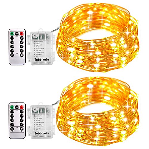 Tobbiheim 2 Set Fairy Lights String Battery Operated Waterproof 8 Modes 60 LED 26.2ft Copper Wire Light with Remote and Timer IP68 Battery Case for Outdoor & Indoor - Warm White(Battery Not Included)