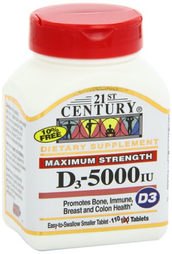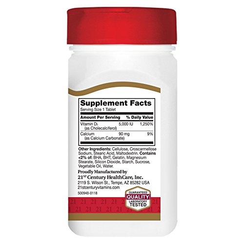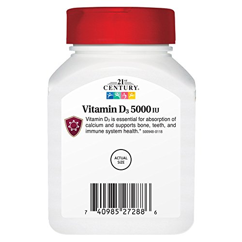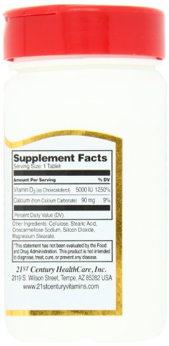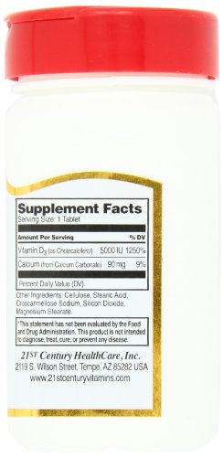 Vitamin D is essential for absorption of calcium to promote strong bones.* Vitamin D also supports a healthy immune system and breast and colon health.* Unconditionally guaranteed for purity, freshness and label potency. No added Sugar, Yeast, Preservatives or Artificial Flavors. 21st Century Vitamins and Supplements are manufactured in a cGMP facility under the strictest standards for product quality, including potency and purity. 21st Century prides itself on providing you with a great product at the best value. *This statement has not been evaluated by the Food and Drug Administration. This product is not intended to diagnose, treat, cure, or prevent any disease.Feature