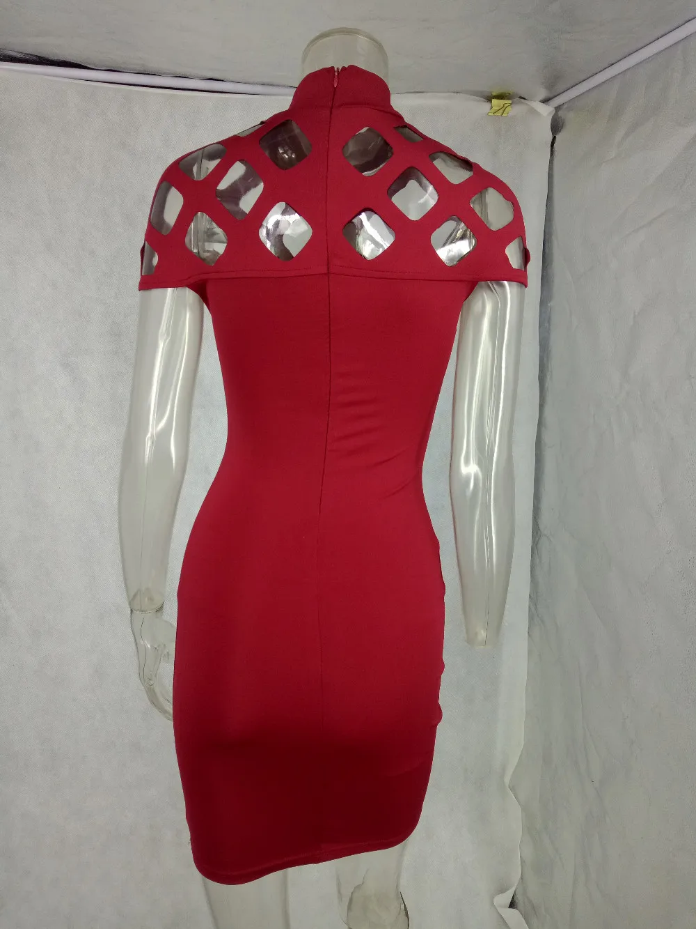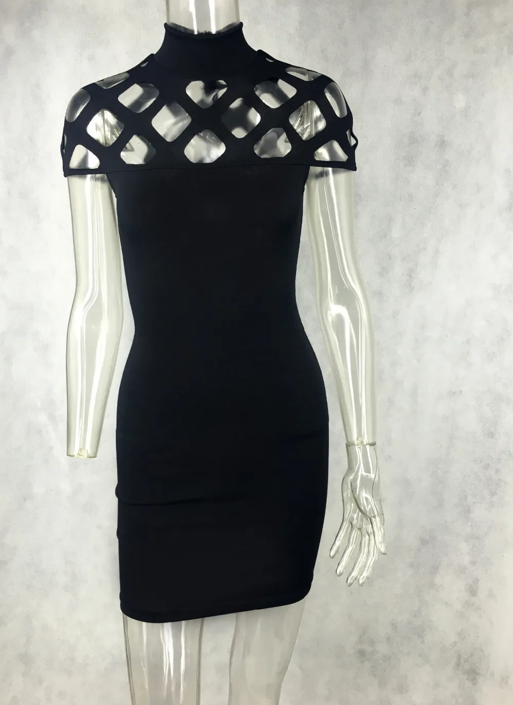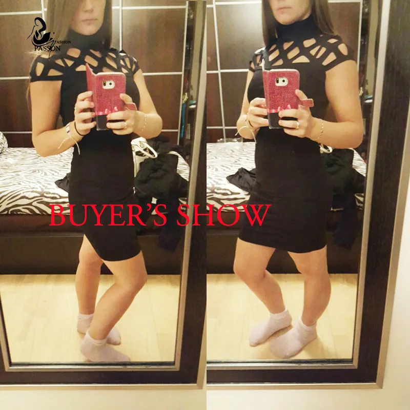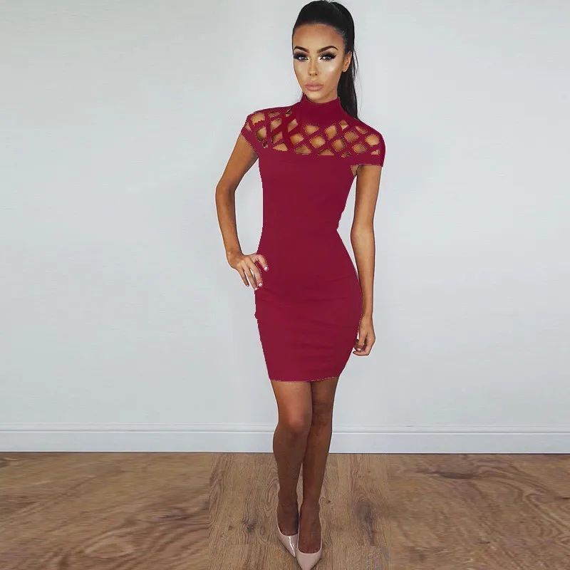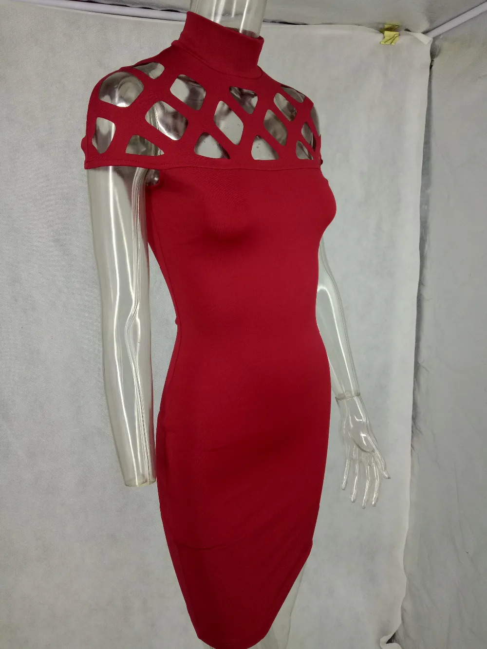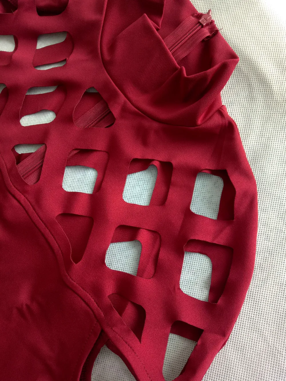 wholesale new autumn black red high neck evening party dress sexy short sleeve hollow out top women bodycon bandage dresses