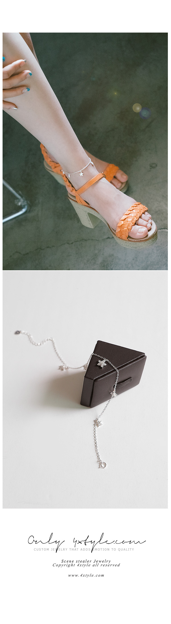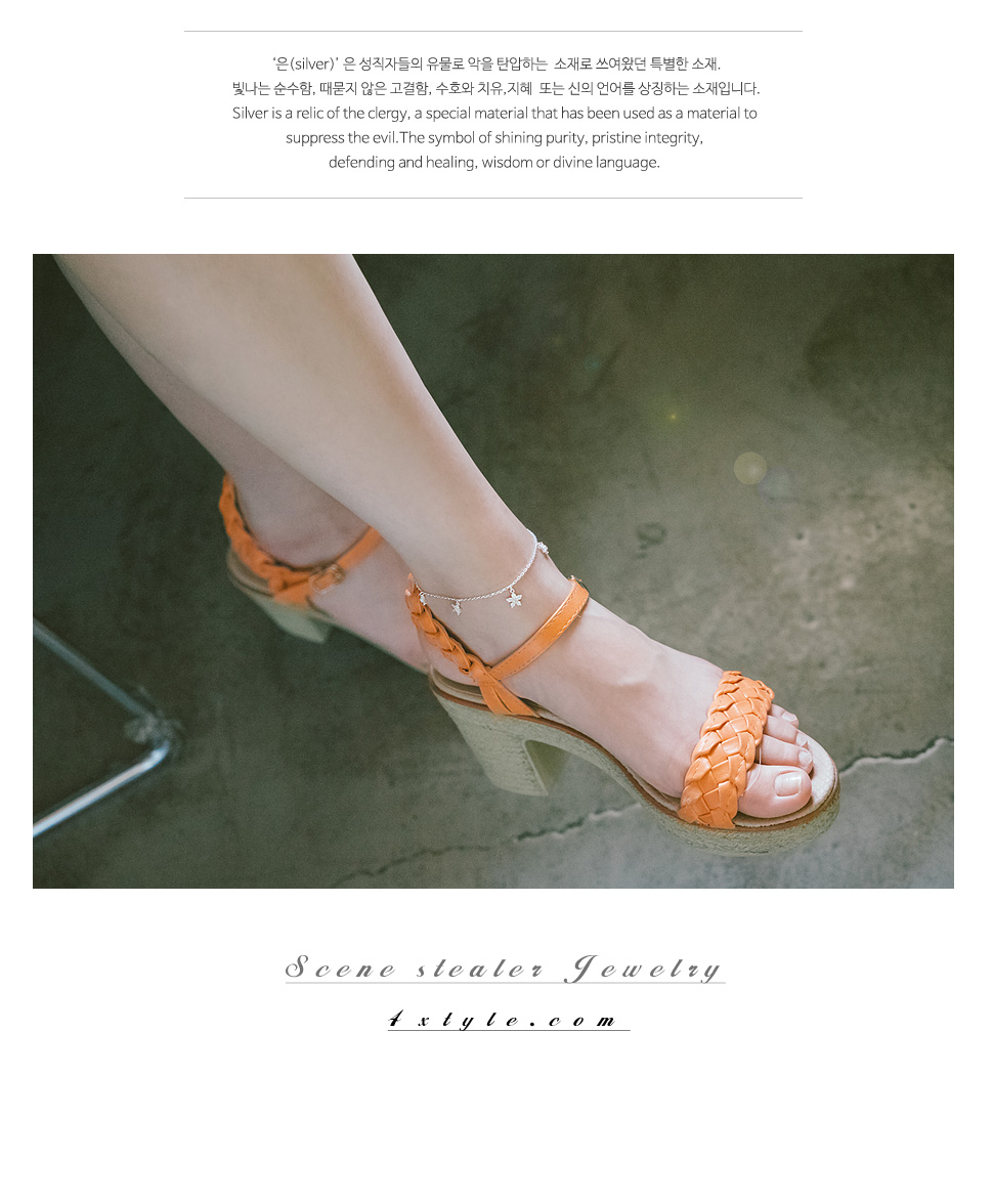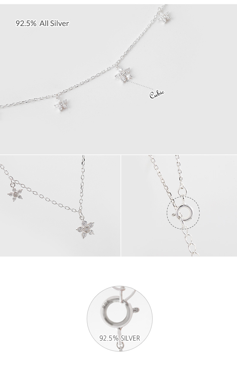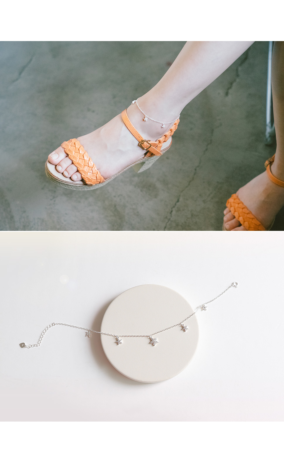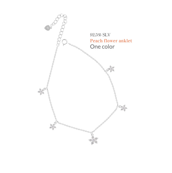 화이트 운동화나 여성스러운 샌들에도 모두 잘어울려 썸머시즌 사랑받을 아이템! 큐빅이 가득한 플라워 장식이 러블리한 92.5 실버 발찌제품.