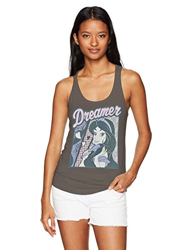 Let's hope one of your three wishes is finding the Disney Aladdin Jasmine Dreamer Charcoal Gray Racerback Tank Top! Jasmine is displayed in a fun pastel comic book style below "Dreamer" on this slim fit gray Jasmine tank top.Feature