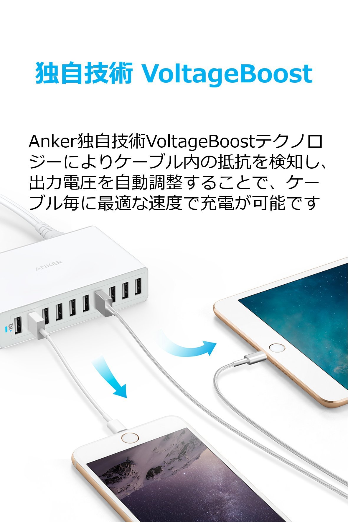 Anker's proprietary technology, PowerIQ and VoltageBoost realize ultra-fast charging.