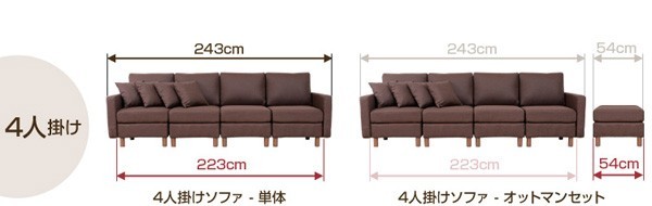 【商品について】※こちらのページは【4人掛けタイプ】のページです※■サイズ:ソファ本体外寸:(約)幅243x奥行き73x高さ79.5cm■カラー:ブラウン ベージュ ネイビー グリーン グレー レッド イエロー ブラック■素材:ウレタンフォーム、コイルスプリング、鉄 ■その他:・お客様組立商品です※お客様で肘掛け・背もたれ・座面などを組み合わせて頂く商品です。・合計9梱包でのお届けです※商品梱包がパーツ毎に分かれているため、パーツが別々のお届けになる場合もございます。