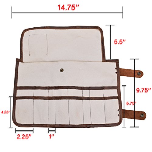- PLENTY OF SPACE FOR YOUR PRIZED TOOLS: With 16 tool slots, you can store a variety of small to medium sized hand tools. Perfect for when you’re on the go as it rolls up neatly and securely closes with heavy duty Brass Metal Snaps for that finishing touch of grace and style. Great protection for your prized tools. (Comfortably fits tools in picture that have a 2.5 inch circumference handle. Longest tool that could fit measures 8 inches in length.