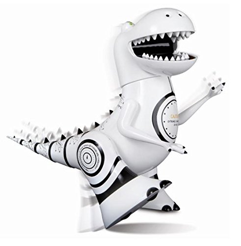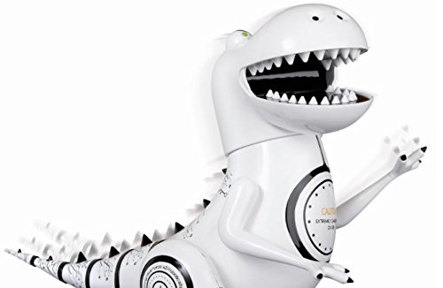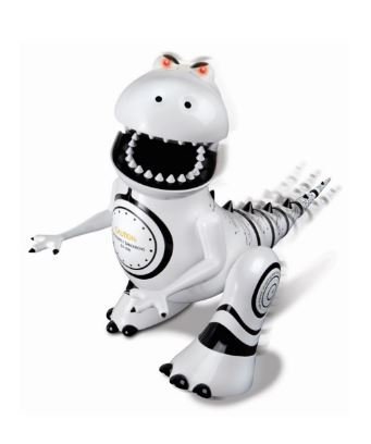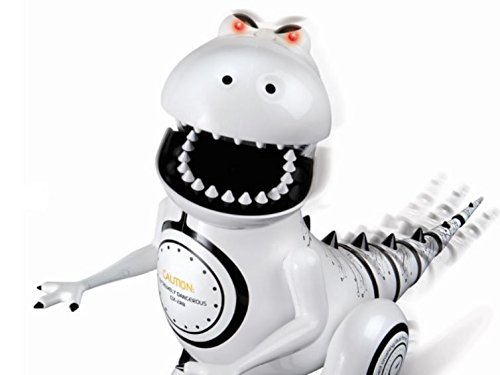 Bring home a new pet with the Shaper Image Interactive RC Dinosaur Robotosaur. This Robotosaur has a full range of emotion. It growls, snores, yawns, and more! You can train your own robotic dino- its built in sensor changes mood! Moves forward, bakwards, spins, shakes, stomps, wags its tail, and more! Glowing LED eyes change color to reflect mood. Full function wireless action. Age: Kids, Teens Color: White, Black Dimensions: 14 x 7 x 11Feature