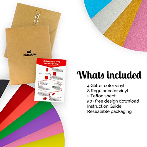 pixmeknot Glitter & Regular heat transfer vinyl KICK STARTER BUNDLE 12" x 10" | FREE DOWNLOAD of 50+ designs for iron on t-shirts, caps & bags | CPSIA material content tested for child safety
