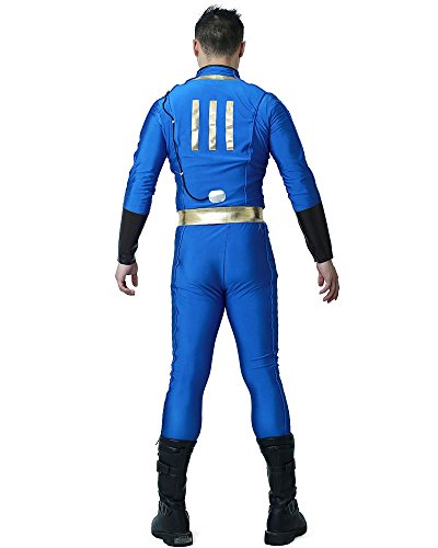 -. Brand : Miccostumes -. Color : Blue -. Department : Mens -. Feature : The whole costume includes a shirt with zipper,a pair of pants and a pair of PU wrist guards. / The shirt and pants are made of lycra which can be stretched. / The shirt has golden hemline and golden stripes on the back of the suit. / The opening of the pants is elastic. / The wire stretching from the left shoulder to the back is vivid. -. ProductGroup : Apparel -. ProductTypeName : ADULT_COSTUME -. Title : Miccostumes Men's Fallout 4 Sole Survivor Nate Cosplay Costume