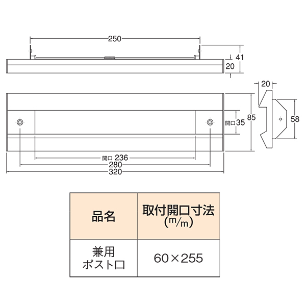 ●スペック:幅(mm)320 高さ(mm)85 取付開口寸法255×60mm