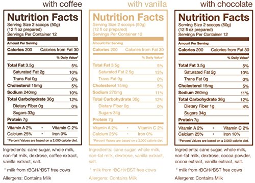 -. Feature : Calories: [per serving] 200 / Servings Per Container: 12 / Allergens: milk / Claimed Weight: 21.2 oz / Recommended Use: nutrition, recovery