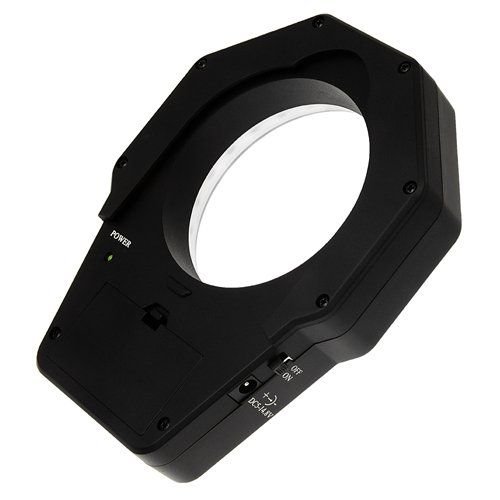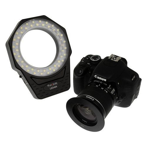 Makro- Ringlicht mit 48 LEDs, das bei Bedarf auch in zwei Hälften geschaltet werden kann. Der Betrieb ist entweder über 2 Mignon-Batterien oder stationär auch direkt über 220Volt Netzteil möglich. Schnelle und praktische Montage durch einfaches Aufstecken auf den vorher am Objektiv eingeschraubten Adapterring, daher kein unhandliches Eindrehen der ganzen Einheit ins Filtergewinde nötig. Schönes Gleichmäßiges Licht, auch im Nahbereich. - Inkl. 6 Adapterringen für 49,52,55,58, 62 und 67mm Filtergewinde - Lieferung ohne Netzteil - Gewicht Lichtring ohne Stromversorgung 140g - freier Innendurchmesser 63mm - - Lichtleistung: 20cm Abstand zum Motiv - 200ASA, 1/60sec, Blende 8. LED technology providing continuous, bright, stable light Brightness adjustment wheel to suit shooting needs Powered by 2x AA batteries, completely portable Great tool for your macro and portrait shooting needs LED 48a Ring Light from Fotodiox Pro is the perfect macro and portrait lighting solution for your DSLR camera. It operates smoothly, giving you steady, bright, and uniform light to achieve your desired photographic effect. The interior area is cut back and angled to allow more light to reach the center of the image area instead of casting a shadow close up like other ring lights. Adapts to most lenses by using P-style adapter rings, comes with 8 filter thread adapter rings (49mm, 52mm, 55mm, 58mm, 62mm, 67mm, 72mm and 77mm). The Fotodiox Pro LED 48a LED Ring light is a wonderful tool for your macro and portrait photo/video needs.Feature