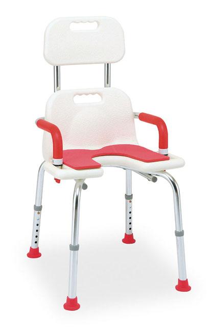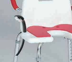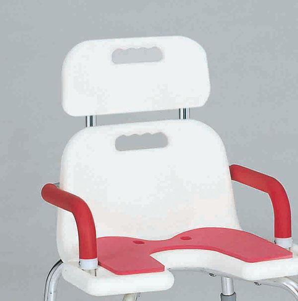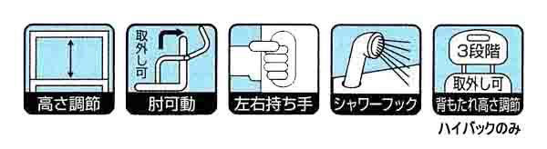 左右に持ち手、シャワーフック付き。座面はクッション付き。背もたれは高さ3段階調節、取り外し可。