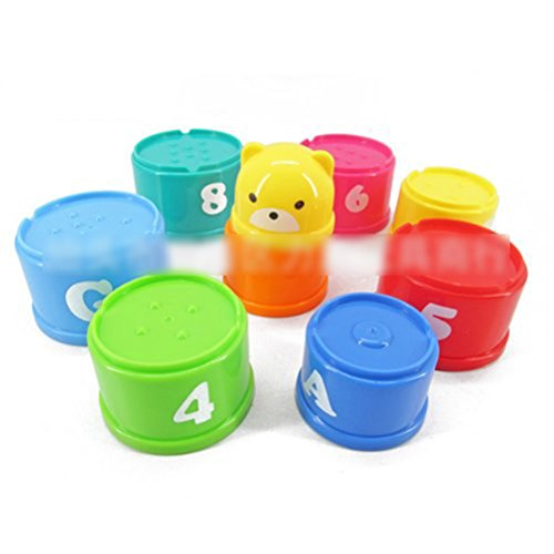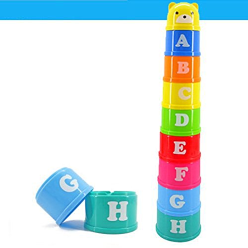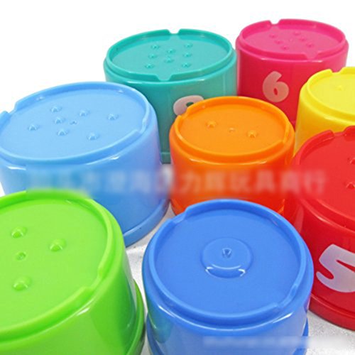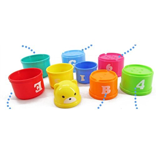- The toy is composed of stacking cups with colorful building blocks of different shapes.