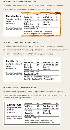 -. Feature : 20g Egg White Protein 100% Paleo / Vegetarian / Non-GMO / Gluten Free (4 ea 3 Flavors 12 Bars) / From 150 Calories+, 5 Net Carbs+, Almost All Carbs From Organic Prebiotic Fiber / Organic Prebiotics & Probiotics For Improved Digestion/Appetite Curbing (From 1g Sugar) / Curbs Appetite Up To 4 hrs Without Bloating / Monk Sweetened / Soy Free / Soft, Creamy, Chewy / Stay Fresh Technology Naturally Preserves Bars Up To 18 Months (Low Water Activity)