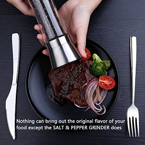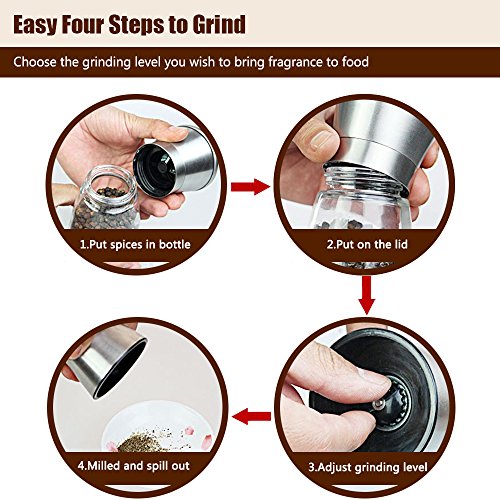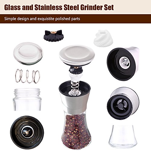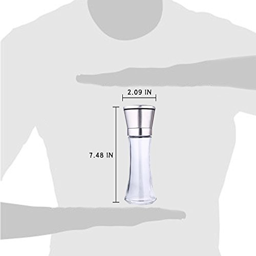 ✔AVAILABLE IN SLEEK DESGIN. Our aesthetical, attractive and hand-sized salt & pepper grinder combines classic and smooth glass, high-capacity, dustproof lid and grinding settings in a unique configuration that all of them let you no more refill frequently and super easy to grind according to multiple markings, even with wet or oily hands.