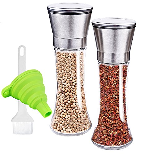 Salt and Pepper Mills, LOXVAO Adjustable Coarseness Shakers and Grinders Brushed Stainless Steel Pepper Grinders and Mills Clear Manual Dishwasher Safe Grinder with Cleaning Brush Funnel Set of 2 6 Oz