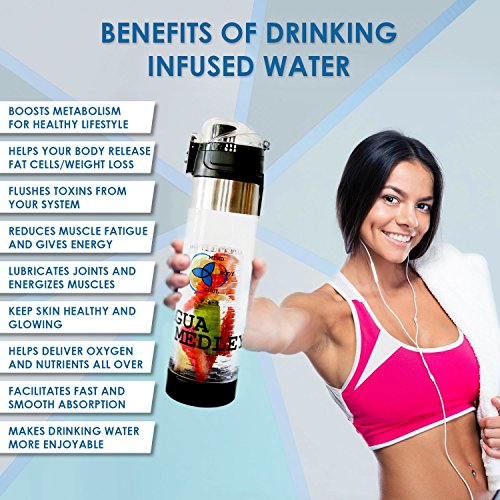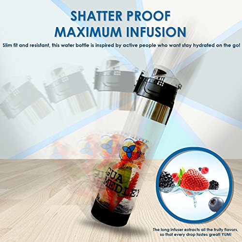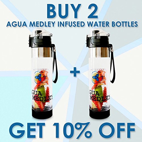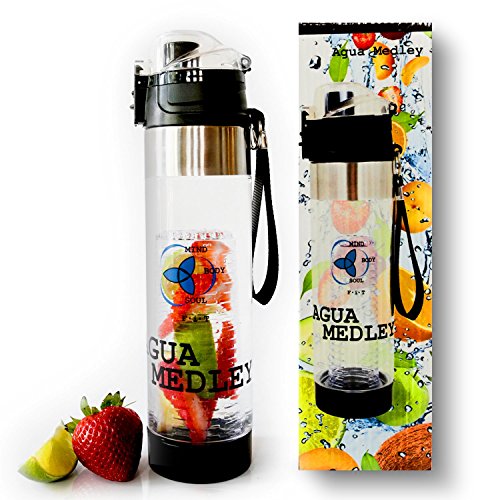 Tired of the classic bland water? The Agua Medley 24oz fruit infused water bottle helps you stay hydrated with delicious fruit-flavored water, anytime, anywhere. 3 in 1 effect: healthy hydration made easy ALL you need to cleanse, detox, and hydrate your body with every sip. For a nutritious hydration, simply load up the full-length fruit infuser rod with delicious fruits or herbs. The insulated sleeve keeps your infused water cooler for longer and protects the bottle from damage. No leakage. No “bottle sweat”. Painless flip-flop lid for stress-free urban mobility. The colorful, arty design invites you to drink more water. Who thought fun-looking fruit infusers can give such a fun makeover to plain tap water? The Agua Medley insulated water bottle is your new portable buddy.Our Special Gift for you: Recipe E-Book