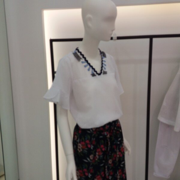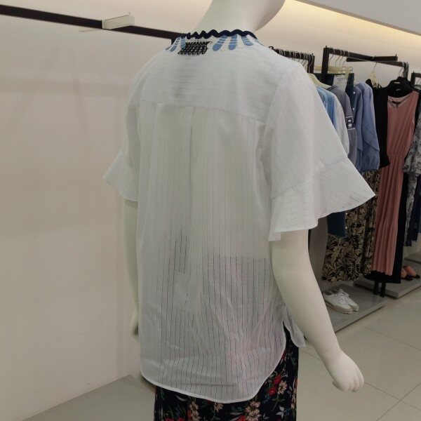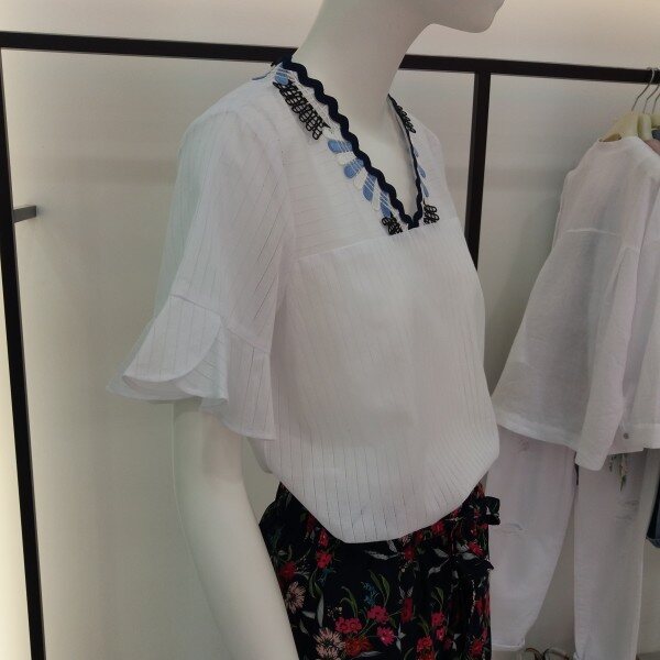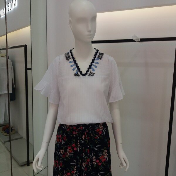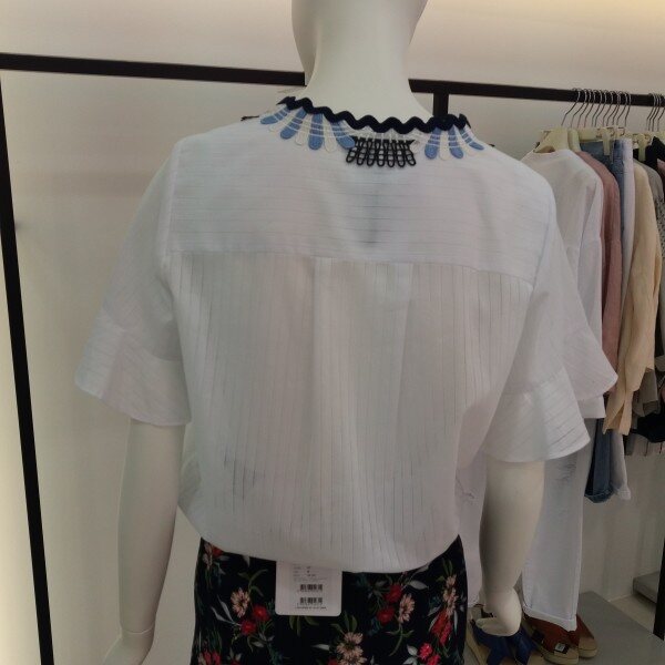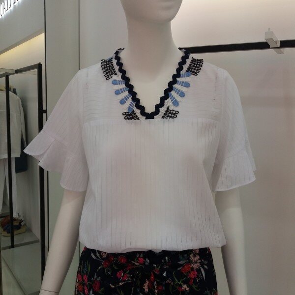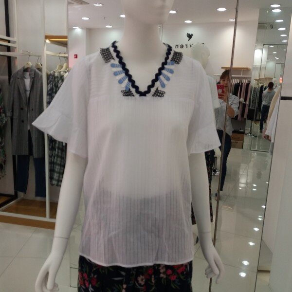 티레 살짝벌어지는 브이형넥에 자수로 포인트를준 블라우스입니다