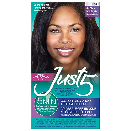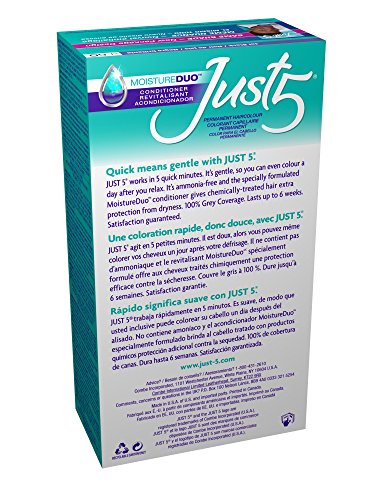 ReleaseDate : 2016-08-27 Studio : Just 5 Publisher : Just 5 Binding : Health and Beauty Product Description Don’t expose your hair to harsh chemicals for a long time to get the look you love. Instead use Just5’s 5-minute ammonia free color to cover your gray. Just 5 blends shades of your own color into the gray so invisibly, even you can't tell which hair used to be gray. It also protects and revitalizes your hair with built in conditioners and 5 super rich after conditioners, for brighter shine and an extra boost of body and manageability. It’s so gentle, you can even color your hair a day after you relax or straighten it! It won't wash out, won't fade out or look dull no matter how often you shampoo. It lasts up to 6 weeks, until your gray grows back. Spend just 5 minutes gently coloring your hair for 6 weeks of coverage, with our super-rich MoistureDuo conditioners to help protect your hair. 0