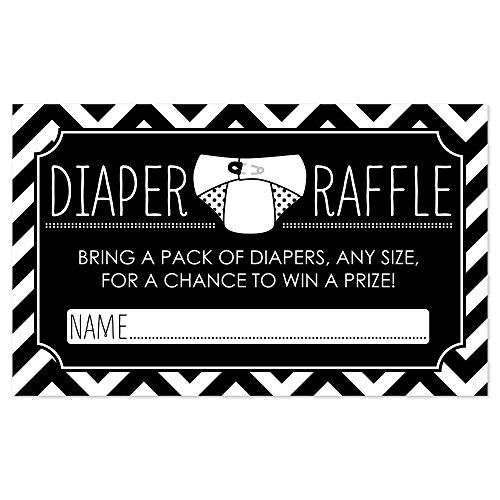 Help stock the nursery by hosting a baby shower diaper raffle. Chevron Black and White diaper raffle cards are a fun way to get everyone excited about a baby shower. Add a raffle ticket to each baby shower invitation, telling guests to bring one package of diapers and the diaper raffle card with their name on it. At the baby shower, have a fun basket or box at the gift table and direct guests to drop their Chevron Black and White diaper raffle ticket into it. Give your guests ample time to arrive and then have a drawing for the prize winner. You can have one grand prize or numerous little ones - either way, a diaper raffle is a fun way to get everyone in on the games AND an easy way to get the parents ready for baby!
