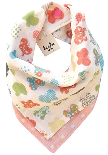 This is a listing for ONE reversible bandana bib. Side A: off-white with multicolor butterfly print, Side B: soft bubblegum pink with white polka dots. What makes our girls bandana bib so special? 1) THE FABRIC. Our Kishu Baby girl bandana bibs are made in the USA from premium 100% cotton muslin imported from Japan. We love muslin because it is breathable, durable, lightweight, quick to dry, absorbent, and super soft. 2) REVERSIBLE. With each of our drool bibs you always get 2 unique styles in one 1 bib! When your teething baby finishes soaking Side A, simply unsnap and flip to Side B! 3) ADORABLY FASHIONABLE. Tired of ugly feeding bibs and oversized cheap bandana bibs that look like a smock or apron? Our dribble bibs are beautifully shaped and tastefully sized for baby girls ages 3 months to 24 months. Please note that our bibs may fit snug around the neck of some babies. As your baby girl becomes more active at around 6-10 months on average, her neck will begin to thin out and our Kishu Baby bibs will fit beautifully! 4) ADJUSTABLE. Each dribble bib has 2 KAM snaps (CPSIA compliant, lead free, Oeko-Tex Standard 100 certified) that stay tightly shut without constantly falling off. No scratchy velcro to irritate your baby's sensitive skin. Neck size is approximately 12 to 13 inches (depending on which snap closure you use). 5) MULTIFUNCTIONAL. This bandana bib grows with your baby girl! Use as a wipe cloth for messy little hands and faces (unfolds into a perfect square). Or hang baby bib in powder room for your child to wipe hands without using a step stool (has a sewn in fabric loop so you can hang from a hook/handle). Disclaimer: Even though you may find this baby bib in the feeding section of this website, we do not recommend using it as a feeding bib at mealtime. Works best as a fashion accessory, dribble bib, and nursing bib during breastfeeding. Smile more and work less trying to coordinate the perfect outfit! Let our Kishu Baby bibs do the work for you!Feature