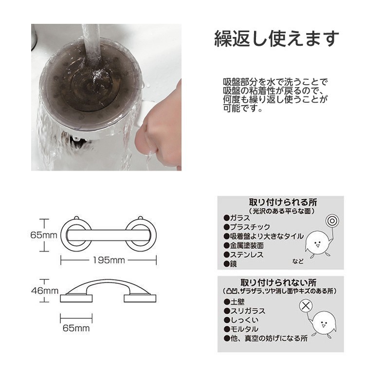 【ドアハンドル ドア ドア開閉 ドア補助 】【仕様】■サイズ:66mm×195mm×46mm■入り数:1個■取付けが簡単な吸盤ハンドル重い引き戸や大きな窓を簡単に開閉できる補助ハンドル。強力吸盤でどこにでも設置できるから便利!接着剤や工具は不要!■耐荷重 1kg■使用方法 1.取り付ける部分をタオルで拭きます。2.吸盤から保護フィルムを剥がしてください。3.吸盤を取り付けて下さい。4.Closeの方に回して下さい。5.しっかりと固定されているかを確認いてください。(実際に本体を触って確認してください。)6.問題がなければものをかけたり、補助ハンドルとしてお使いください。 ■ご注意 荷重制限を守ってください。貴重品や壊れやすいものは絶対にかけないでください。直射日光の当たる窓ガラスでの使用はおさけください。破損、事故に関しては責任を負いかねます。