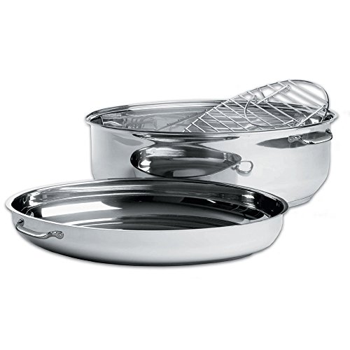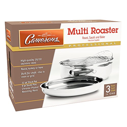 Multi-use roaster. All stainless steel construction with tri ply brushed Stainless Steel cooking surfaces on top and bottom pan allows you to use them separately as saute pans or all together as an extra large roaster able to accommodate up to a 20lb turkey. Side mount diagonal handles allow for more access in crowded ovens. Top can be used as a saute pan, bottom can be used as a stock pot and both pieces together make a great covered roaster. Each unit comes with a rack which hangs up on the edge of the roaster to allow products to drain into the base. Polished interior and exterior allows for easy cleaning - Fully induction capable.
