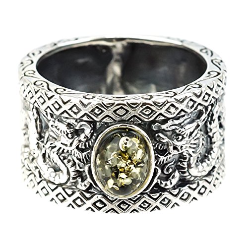 -. Title : ジナブリング (JINA BRING) グリーンアンバー緑琥珀 リアルドラゴン向い龍 彫刻画 幅14mmの贅沢なワイドリング 平打リング シルバー925