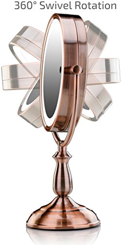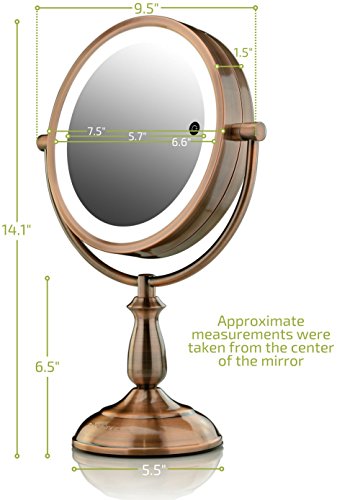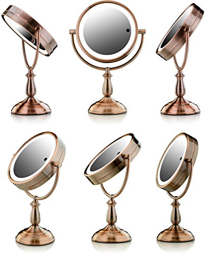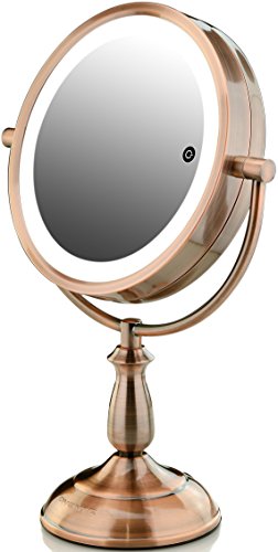 Ovente 7.5” Lighted Tabletop Vanity Mirror, Battery or Cord Operated, SmartTouch Cool, Warm, Daylight LED Tones (1x10x Magnification, Antique Copper) (MPT75CO1X10X)