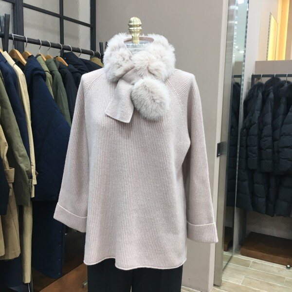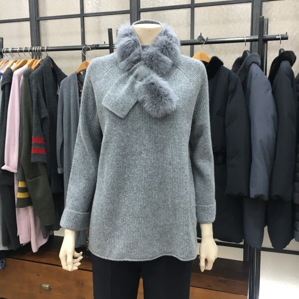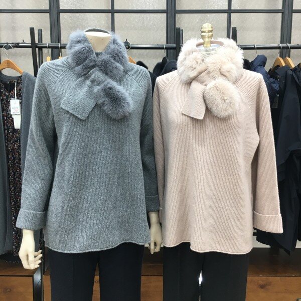 부들부들함의 정석인 캐시미어 혼방 니트!! 터틀넥 디자인에 퍼 머플러까지 세트 형태로 디자인 되어 나온 제품인데요~ 모와 캐시미어가 혼방된 고급스러운 소재로 피부에 닿는 터치감과 탄성이 너무 매력적이랍니다! 나그랑 숄더 라인으로 부해 보이지 않게 똑 떨어지는 핏이 슬림 해 보이면서 손등을 덮고 롤업한 느낌의 슬리브가 여성스러운 아이입니다. 세로로 깊게 들어간 짜임으로 밋밋하지 않게, 세련된 포인트를 더했어요. 머플러를 하시면 세트에서 느끼지는 우아함이! 안하시면 기본 베이직한 터틀넥 니트로 ! 디자인으로 두고두고 오래 활용될 아이템!단독은 물론 아우터 이너에 찰떡이랍니다~ 총장길이는 55사이즈 기준으로 65m 입니다.