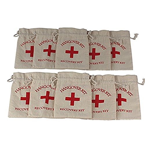 -. Feature : Set of 10,10*15cm(4 x 6inch), 100% Cotton / Perfect for Bachlor or Bachelorette Parties, Wedding Welcome Gift Bag, Birthday Celebration / Classic red cross + hangover kit + survival kit P.R.Inted on off-white cotton bag / Perfect for packaging DIY wedding favors e.g. Chocolates,sugared almonds,handmade soap,fresh coffee beans.etc. / It is so easy to open the bags,Double beam mouth design, better and convenient than most products in market.