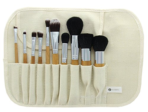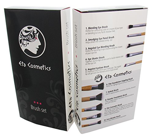 -. Feature : This ETA makeup set includes all the essential pieces your makeup need: Foundation brush, powder brush,Blush/bronzer brush;Eyeshadow brush, eyeshadow blending brush, eyeliner/brow brush and more.... The foundation brush is 6.5 Inch, 2 smaller Kabuki brush and powder brush are 6.25 Inch long. / Simple Elegant Linen Pouch for easy Storage and Travel. Won't get hot like synthetic type of material would if you leave them in the car under sun for a long time. It is also washable. / The bristles are super soft, the ferrules are sturdy, the handles are solid bamboo shaped to a easy grip. Each brush independently wrapped with plastic protector! / This makeup brush set offers a picture perfect, streak free finish any makeup artist is looking for with a fraction of market P.R.Ice! Natural hair brush are the best for powder products -- powder blush, face powder, bronzer and eye-shadow. When the hairs are applied with pressure, they have more texture than synthetic bristles and therefore pick up powder well and blending is made easier and more natural on the skin. You can't blend as well with synthetic bristles because the bristles don't move as freely as natural hair bristles do. Natural hair brush also can avoid getting straw feeling with some lower level synthetic hair could. / Natural hair brushes pick up powder color better! Natural hair brushes apply powder more sheer! With the help of ETA cosmetics natural hair brushes, you are guaranteed a streak free, flawless sheer finish. You can proudly step out of your powder room every morning and embrace a new day with a beautiful yet natural new look everyday. We have spent much more money in big brand name brushes in department store, but it is never too late to try this equally good quality ETA brush set with a fraction of the market P.R.Ice. Let yourself be the judge and with the 100% hassel free return policy as back up, don't miss the opportunity to try this ETA brush set before the P.R.Ice goes up. And you can always return it with full refund if you are not satisfied and we will still send you a travel makeup brush kit OR ETA stand alone Taklon hair brush ( also sold on Amazon)completely FREE for your efforts of trying.