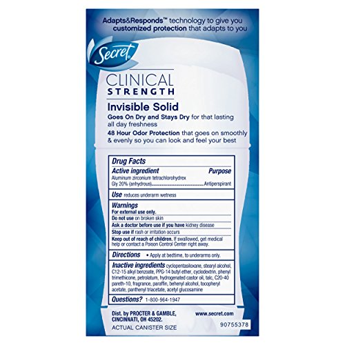 -. Feature : Secret Clinical Strength Invisible Solid goes on dry and stays dry / Adapts&Responds Technology helps give you customized protection that adapts to you / 4X protection from stress sweat (vs. the wetness protection required of an ordinary antiperspirant) / Prescription-strength wetness protection equivalent to a 6.25% aluminum chloride Rx product