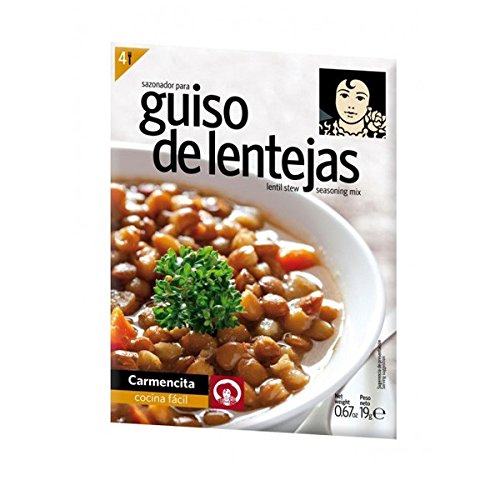 -. Binding : Misc. -. Brand : Carmencita -. EAN : 8413700431876 -. Feature : Get the authentic flavor of Spanish Lentil Stew with this select seasoning mix from Carmencita / Seasoning mix for "GUISO DE LENTEJAS" / Contains 2 packets of 19 grams each. Each packet makes 4 servings / Make the best tasting lentil lentil stew ever! / A portion of the proceeds of this sale are DONATED to charities that help preserve the environment -. IsAdultProduct : 0 -. NumberOfItems : 2 -. PackageQuantity : 2 -. ProductGroup : Grocery -. ProductTypeName : GROCERY -. Size : 19 grams -. Title : Lentil Stew Seasoning Mix Spices 2 Packets 8 Servings Total Carmencita Guiso de Lentejas Product of Spain