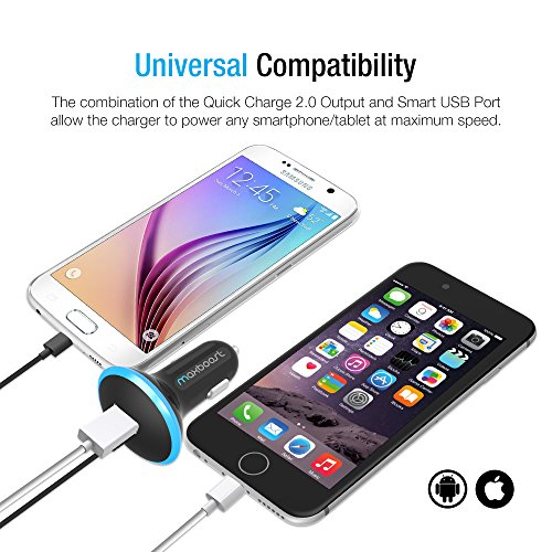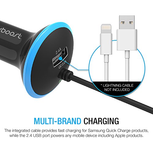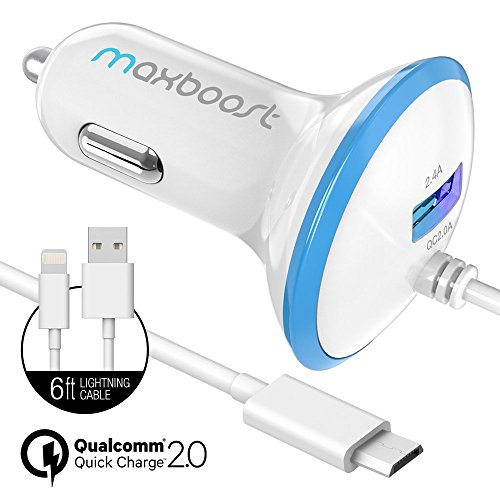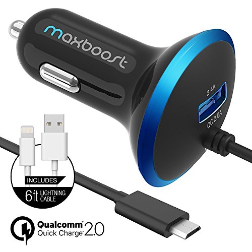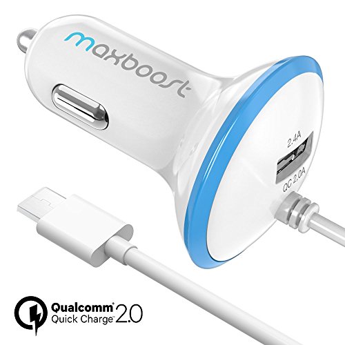 Introducing the Maxboost Car Charger with Qualcomm Quick Charge 2.0 TechnologyThe Maxboost Car Charger is a highly durable, ultra-portable, universal charger for the car, featuring a powerful single 2.4A USB port for charging almost any device including tablets at maximum speed, as well as an integrated 3’ ft certified micro-USB cable with Qualcomm’s Quick Charge 2.0 Technology. With our Maxboost Car Charger accessories, now you can charge up to 75% faster with Quick Charge compatible devices! Additional LED Halo ring surrounds the car charger for easy use at night or in the dark.