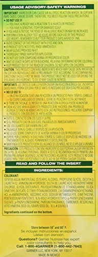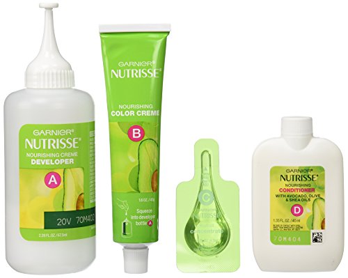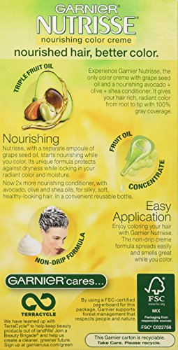 Experience Garnier Nutrisse, the nourishing color treatment that gives you rich, healthy-looking color. This exclusive color treatment, enriched with conditioners and fruit oil concentrate, penetrates deeps into hair fibers to deliver rich, long-lasting color that covers gray completely. Enjoy the unique avocado enriched conditioner that harnesses the restorative properties of avocado oil with Vitamin E. It protects against dryness while locking in color and moisture to keep your color radiant and your hair silky soft. With an easy application, you'll love coloring your hair with a nourishing creme formula enhanced with fragrant grape seed oil you only get from Garnier Nutrisse. The non-drip formula spreads easily and smells great when you color.Feature